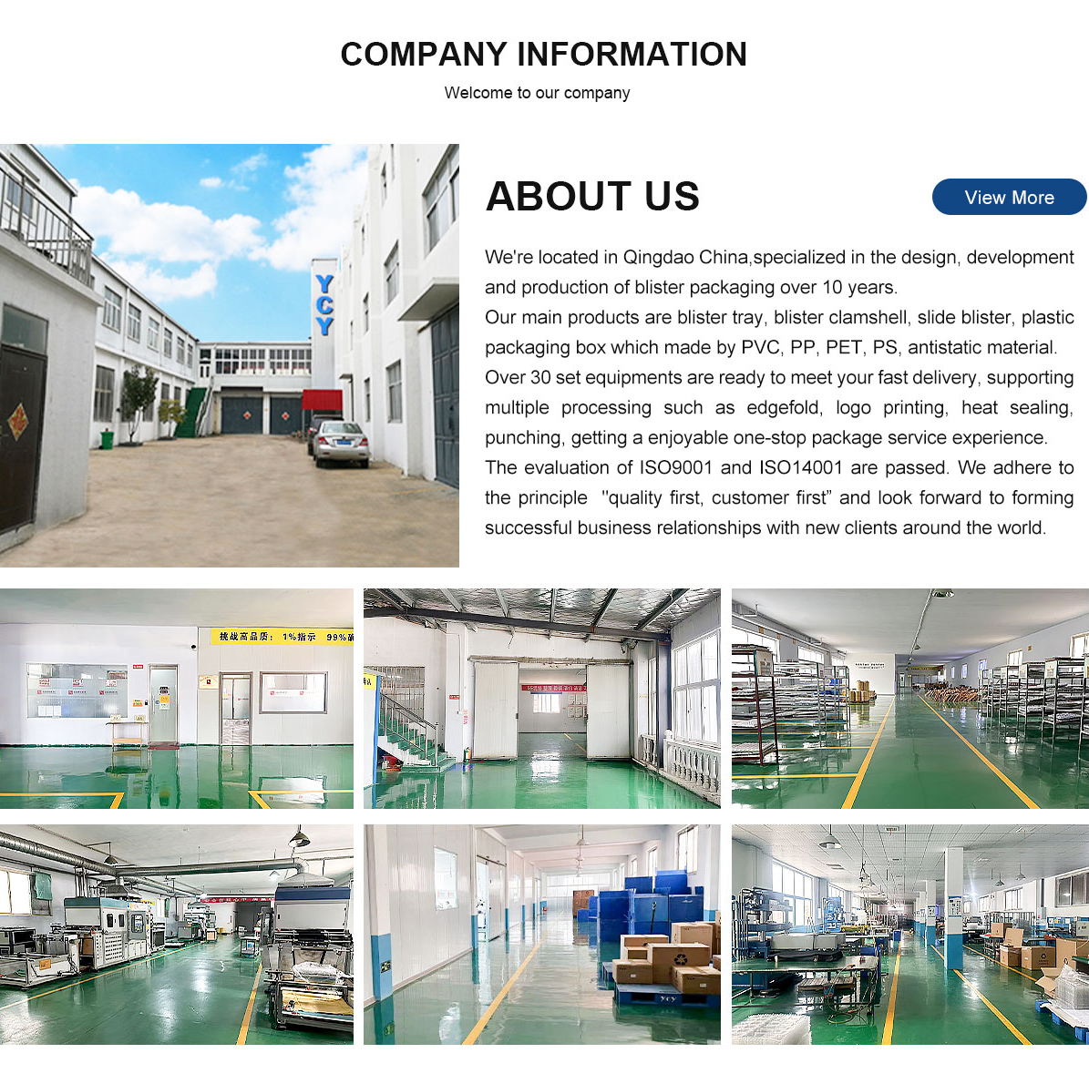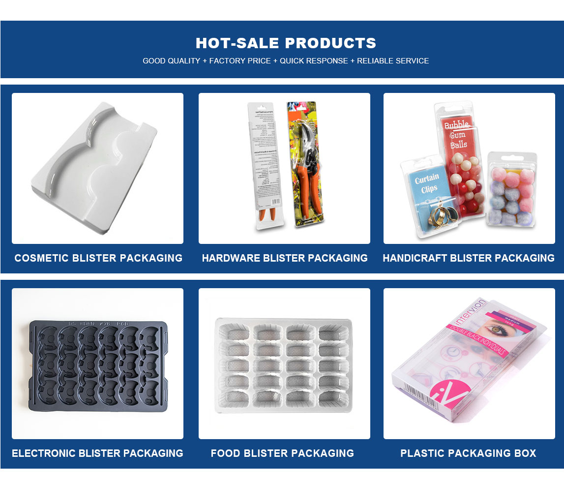 Principaux produits : Emballage blister, plateau blister, emballage blister de carte coulissante, emballage à clapet, boîte d'emballage en plastique